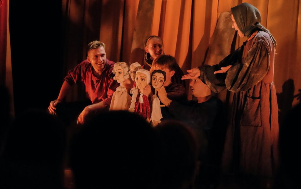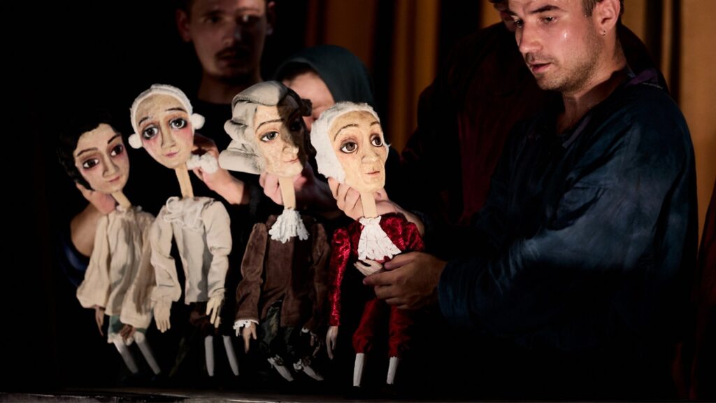 Кстати, возможно, это случайное совпадение, но в сценарии есть моменты, которые в чем-то отсылают к кукольному театру. Так, по пути в столицу артисты, призванные из Ярославля, проезжают через храм, где наблюдают за звонарями, а позже, в момент творческого подъема, начинают играть тех самых звонарей — и ошеломлённые очевидцы вдруг слышат колокольный звон. Эти эпизоды, не вошедшие в спектакль, отчасти получают в нём свое развитие — в образах удивительных существ, которые соединены с чем-то высшим, да так так хитро, что не всегда поймёшь, кто кем управляет.