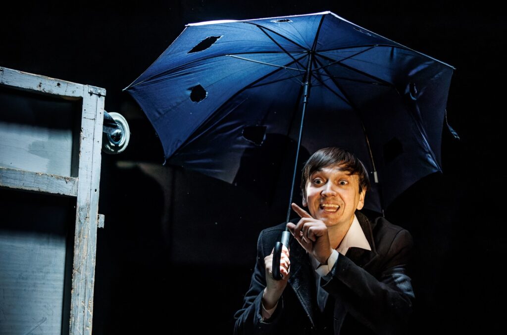 Стодевяностолетний текст Гоголя взывает к современной композиционной подпорке, поэтому время от времени, чтобы отдалиться на средний план и посмотреть на действие беспощадным взглядом современного циника-насмешника, в правом углу сцены появляется артист стендапа, брат-близнец нашего героя и вносит в действие интерактивные черты, свойственные разговорному жанру. «Четвертая стена» изрешечена (как зонт героя) шутками, вопросами в зал, музыкальными экзерсисами.