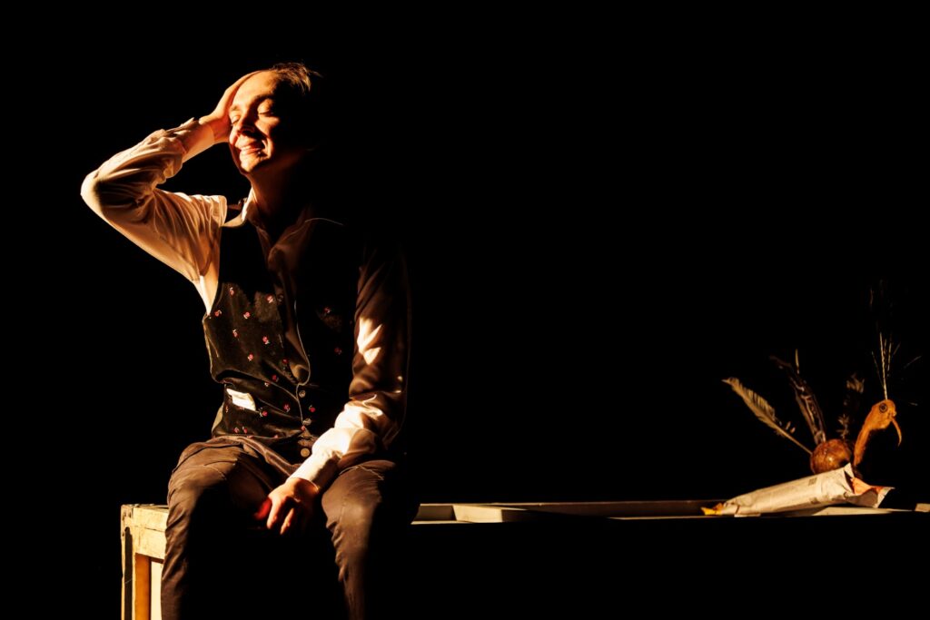 Деревянный ящик – что-то среднее между шкафом, гробом, столом и крестом сопровождает Андрея Дидика на протяжении всего спектакля. Иногда кажется, что актера перепутали с рабочим сцены, так много ему приходится возится с реквизитом. Но надо отдать должное: в этот ящик вместилась вся жизнь нашего героя, включая даже шумный Невский проспект. В этом есть некая экзистенциальная нотка – вся и любая человеческая жизнь заканчивается примерно одинаково.