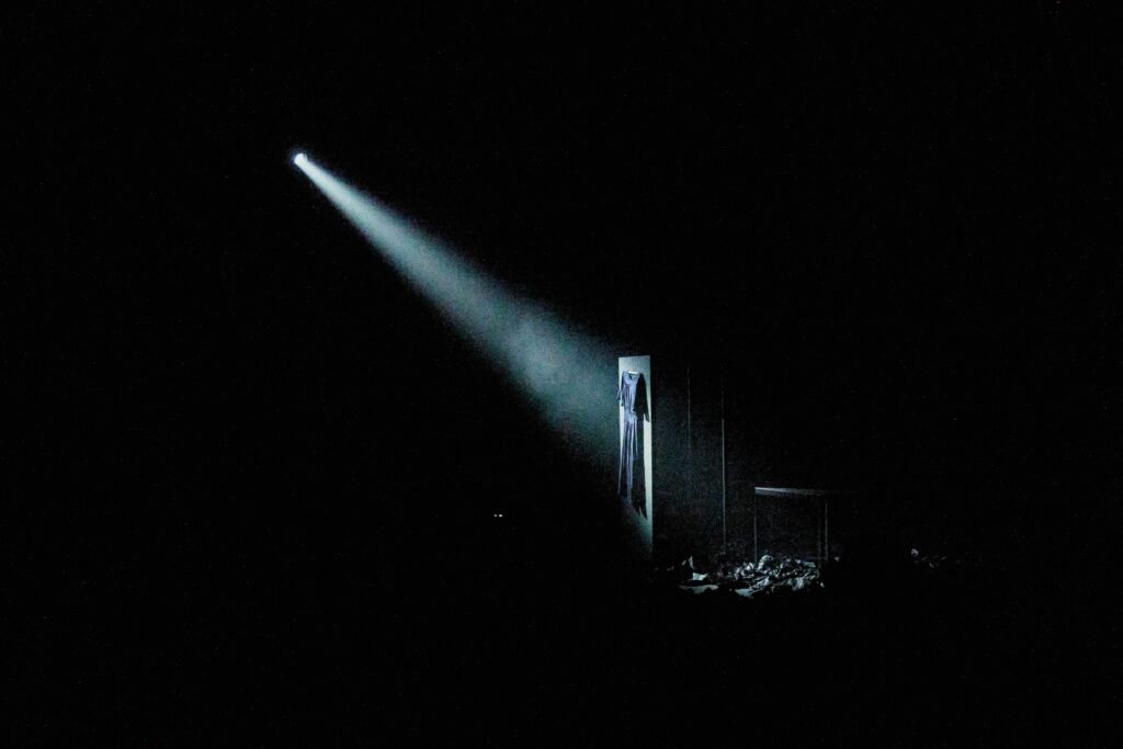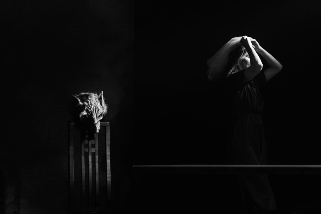 Спектакль Аллы Дамскер «1926» тоже имел в основе поэму «Крысолов» и говорил о любви — о романе по переписке между Цветаевой и Пастернаком. Он надевал всё лучшее сразу и брал зрителя нахрапом: в нем были серо-красные проекции на белой кирпичной стене; образы Ленина, Троцкого и Гитлера; сюрреалистичная «Голконда» Магритта; музыкальные вставки из Баха, Бартока и Пьяццолы в исполнении Дмитрия Синьковского, который играл на скрипке и пел; белая рубашка, которая и младенец, и воплощенный быт, и мостик между возлюбленными, и погребальный саван…