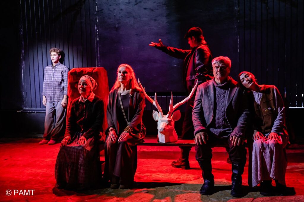 Вместе с художником Лешей Лобановым Печенежский создает строгую, почти суровую вселенную, где нет ничего лишнего и случайного, где все компоненты необходимы и равнозначны. Легенда о Рогатой матери-оленихе (Ольга Гришова) здесь не менее достоверна и реальна, чем жизнь Мальчика (Данила Голофаст) и его семьи. Люди, как древние валуны, навечно укоренились в родной земле. Шорох песка наравне с народными напевами создает загадочную и немного меланхоличную атмосферу, а сдержанная пластика актеров не менее выразительна, чем скупые слова. Каждому герою спектакля – деду Момуну (Олег Зима), Бабке (Наталья Платонова), Орозкулу (Алексей Гладков) и Бекей (Диана Морозова), Мальчику и Оленихе – Печенежский выделяет фрагменты авторского текста, превращая постановку в несмолкающий диалог. В нем значимы все участники, хотя голос Мальчика порой взмывает над хором голосов его близких и даже противостоит им.