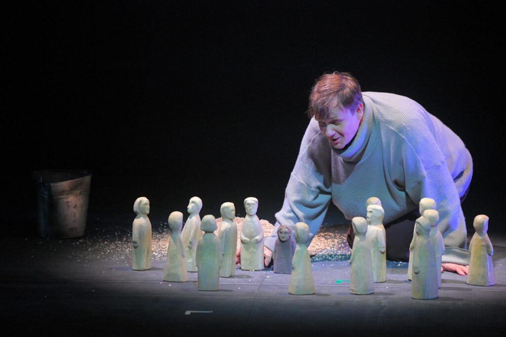 С первых минут зрителя вводят в пространство сознания героя – камерное, почти замкнутое, как шкаф, где в миниатюрных сценках разыгрываются драмы и откровения. Это рамки мира и рамки сознания, из которых невозможно выбраться. Маленькие куклы и большие фигуры, маски и тела, проекции и живое присутствие актёра Дмитрия Войдака создают зыбкое пространство, где всё колеблется между жизнью и смертью, реальностью и сном.