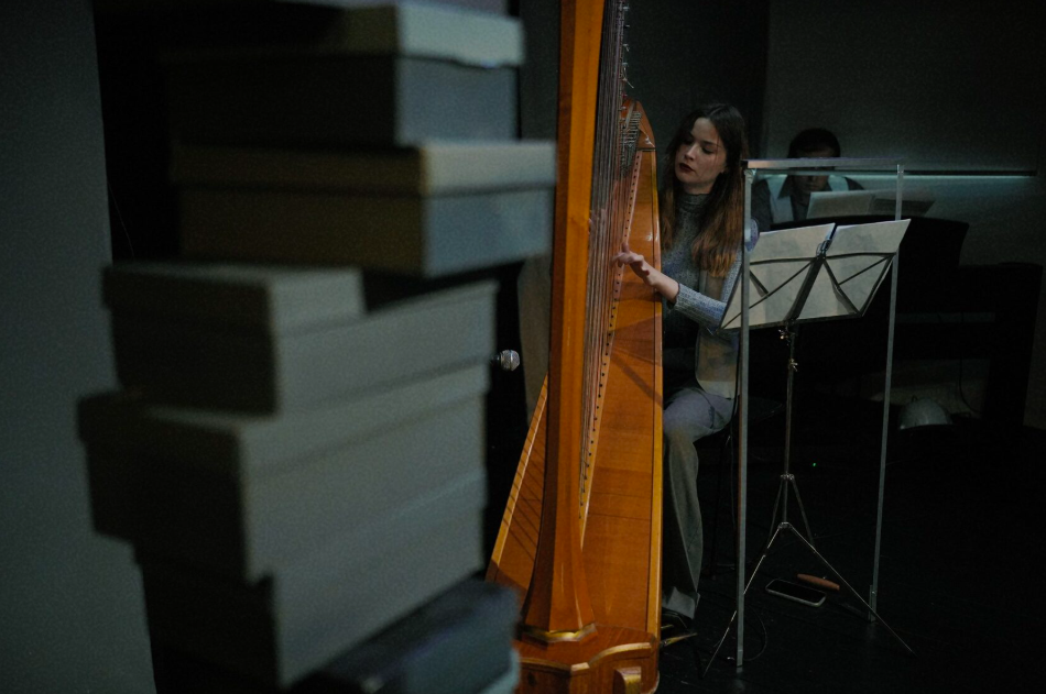Мост между конкретным 2025-м и абстрактным 1925-м строится с помощью звука — дорогу прокладывает музыкальное полотно, которое специально для «Сна» создали Владислав Федоров и Ярослав Коваленко, основатели творческого объединения mader nort. Сделав, к слову, таким образом закономерный шаг на своем пути амбассадоров музыкального минимализма: кажется, в последние несколько лет никто в Петербурге не играет Симеона Тен Хольта, Джона Кейджа и так далее чаще, чем они. Музыка к «Сну Левинсона» отсылает то к Canto Ostinato Тен Хольта, то к Marimba Phase Стива Райха и в целом представляет собой классический минималистский опус — разве что смонтированный из нескольких частей и для атмосферности дополненный шумовой партитурой. Это очень логичная параллель: архитектуру не зря называют застывшей музыкой, а здания конструктивиста-Левинсона могли бы звучать именно так.