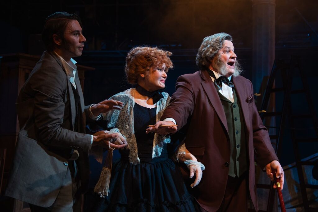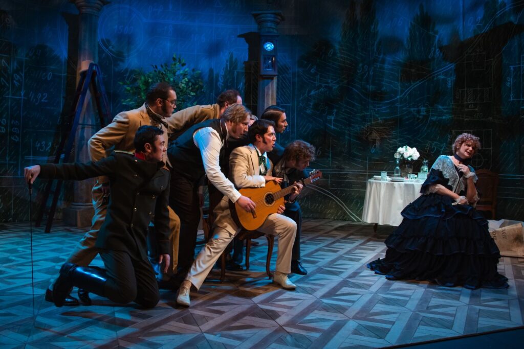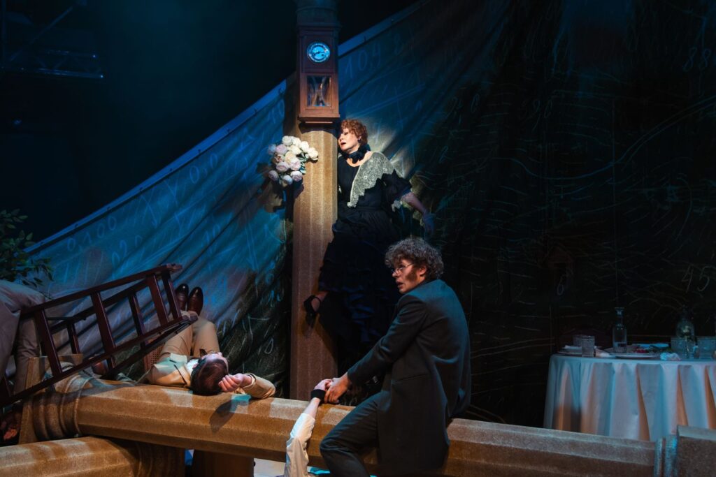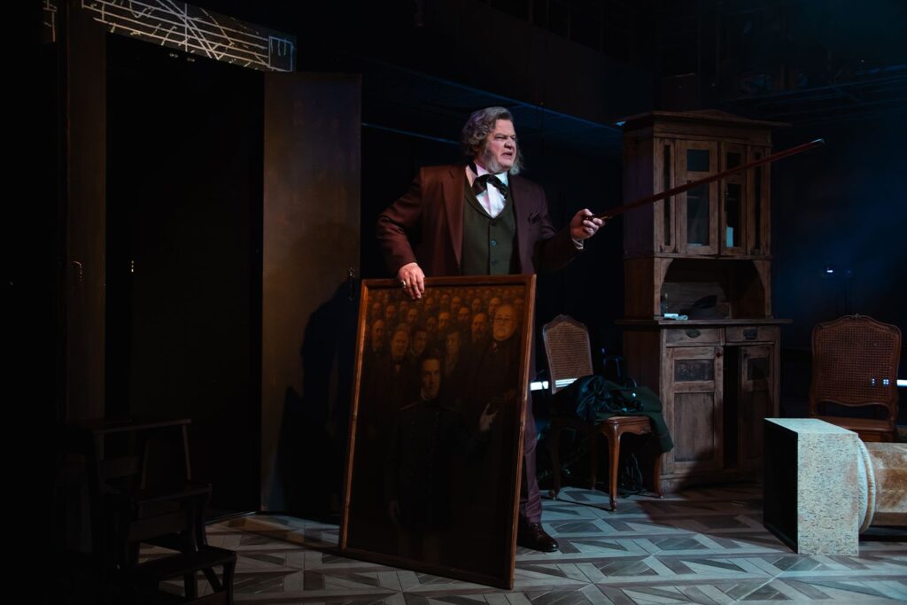 Режиссер Юрий Буторин создал игровое пространство, в котором «играют» не только персонажи, но и предметы. Летят вилки, падают колонны, рушится мебель. Все доведено до гротеска, бытовая история про тяжбу между братом и сестрой, которые не могут поделить наследство, доставшееся им от тетушки, обретает черты веселой фантасмагории.