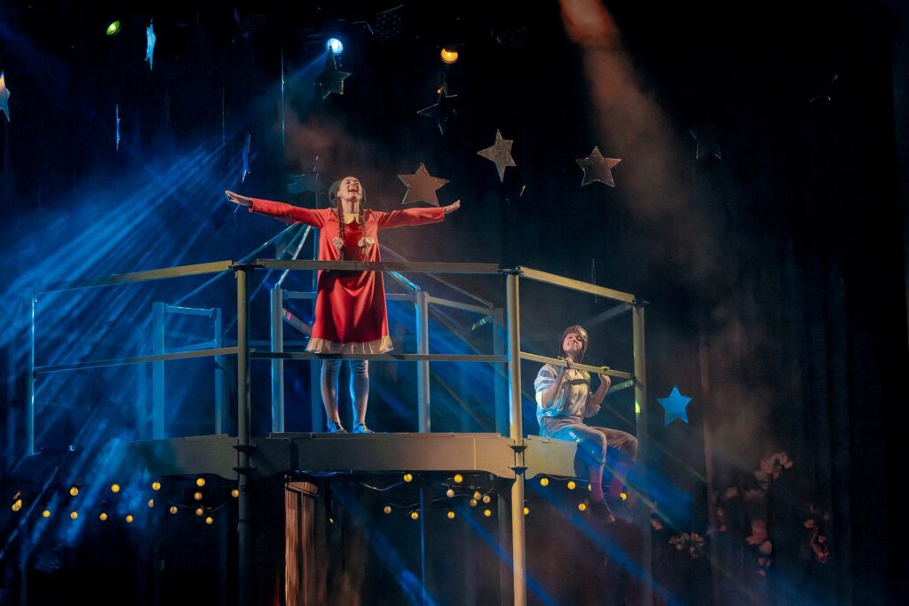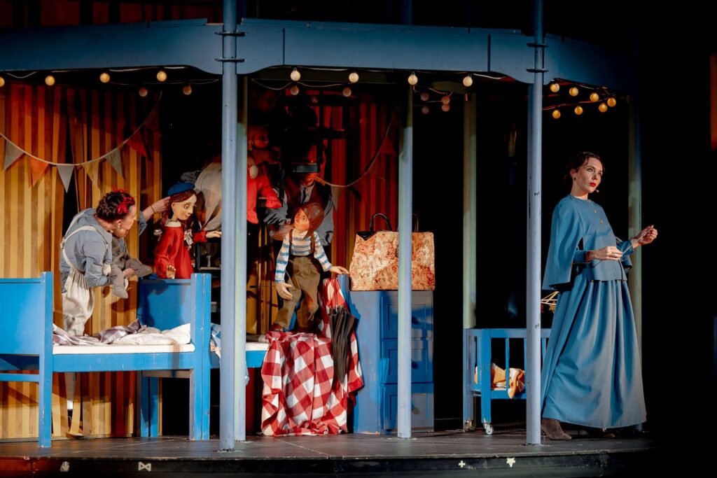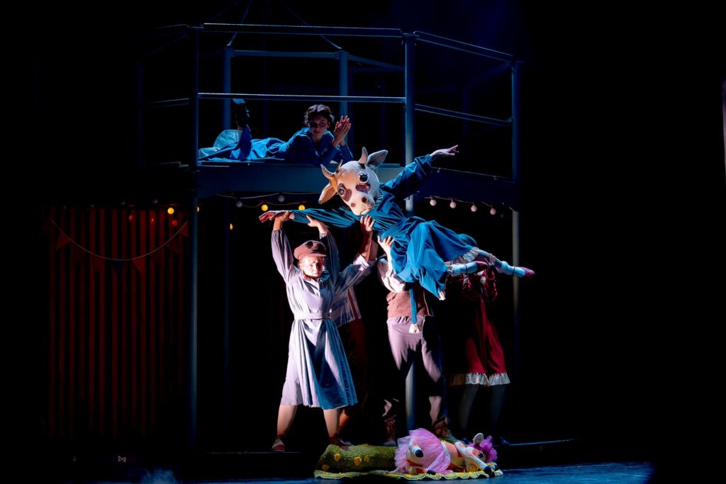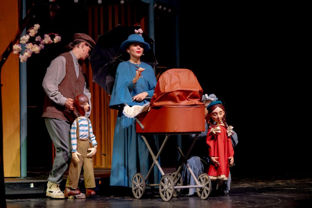 В спектакле удивительно продумана «оркестровка» сцен: марионетки, ростовые фигуры, планшетные и тростевые куклы сменяют друг друга в плавном, почти музыкальном ритме. Каждый персонаж – будь то огромная танцующая корова или крошечная Мэри в кондитерской – появляется ровно тогда, когда чудо нужно больше всего. Актёры мастерски переходят от живого действия к управлению куклами, создавая ощущение, что границы между человеком и его образом стираются.