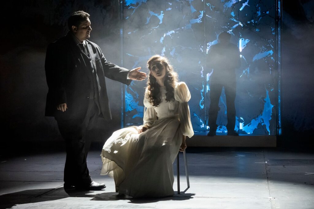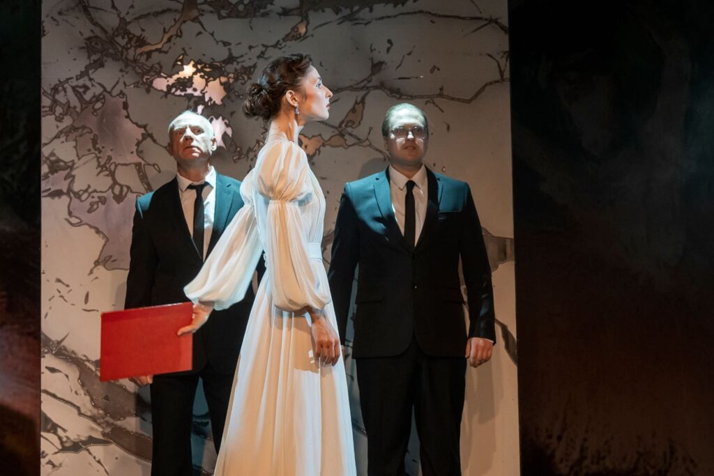 Это не значит, что роман Беляева нужно предать забвению, но предполагает, что работа над ним потребует от режиссера дополнительных усилий. Однако Александр Локтионов не пошел сложным путем. Его постановка – идеальное решение для тех, кто хочет ознакомиться с содержанием «Властелина мира», не открывая книги. В инсценировке сохранены все сюжетные повороты. Дамы в воздушных белоснежных нарядах (Эльза Глюк – Арина Половинкина, Эмма Фит – Валерия Кокшарова) и мужчины в строгих черных костюмах (Людвиг Штирнер – Игорь Сидоркин, Отто Зауер – Александр Кравченко) старательно, а порой даже эмоционально обмениваются репликами. Иногда их прерывает Репортер (Константин Житинев) в дождевике и с поломанным зонтом; он сообщает о проблемах национального и мирового масштаба, которые спровоцировал Штирнер. По полупустой сцене катаются огромные мраморные панели (художник-постановщик – Артем Гайнанов). Периодически свет начинает мигать, а персонажи – глупо улыбаться и говорить измененными голосами (значит, они поддались влиянию телепата Штирнера).