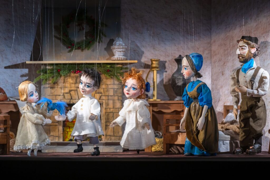 2025 год стал для театральной России годом переломным, и вот почему: 29 декабря 2024 года, последний раз перед закрытием на ремонт на сцене МХАТ им. Горького была сыграна «Синяя птица» Станиславского. Таким образом символически завершился театральный марафон длиной в 116 лет (или ровно 100-летний марафон, если считать от сокращенной постановки, осуществленной Станиславским в 1925 году). Конечно, мы верим, что птица счастья в своем первообразе вернется на сцену театра Дорониной, но факт остается фактом: уже целый год с хвостиком русский театр живет в «модусе покинутости». Герои Метерлинка-Станиславского отвернулись от нас к пресловутому заднику из черного бархата, и душа, как Доронина МХАТ, покинула русский театр. Поэтому, наверное, в последнее время появляются знаковые воплощения синей или голубой – если следовать Блоку – птицы. В Петербурге стоит отметить два: мюзикл Сергея Плешака на либретто Николая Голя с участием Альберта Асадуллина в театре «Зазеркалье», и рождественскую премьеру 2025-2026 года, семейный спектакль в Театре марионеток им.Деммени.