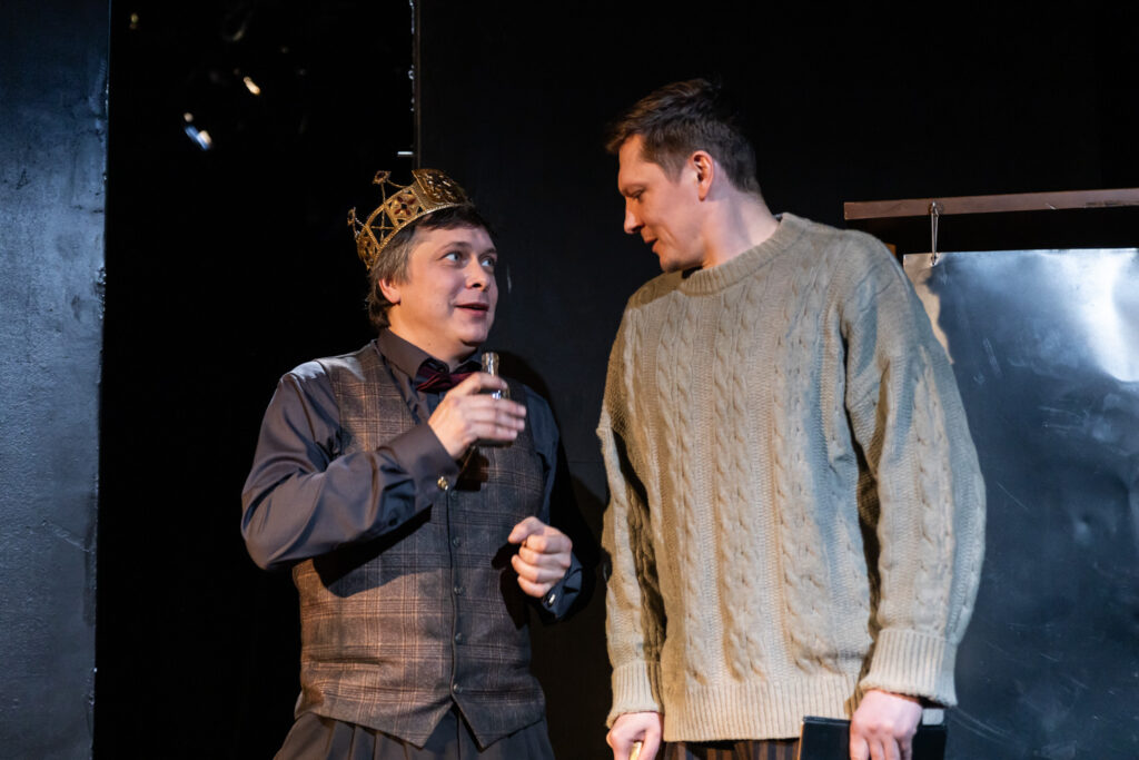 Вместо трона короля Лира – старое, истрепанное кресло, вместо роскошной гримуборной ведущего актёра труппы – проходная комната, захламленная реквизитом и личными вещами, где каждый предмет напоминает о прошедших спектаклях, о людях и событиях, оставшихся за сценой (сценограф Михаил Гербер). «Я раздавлен, из меня по капле вытекает кровь», «Еще, и еще, и еще. Но я не могу больше давать – мне нечего больше давать», «Я – актер, а кому дело до того, буду ли я играть сегодня или завтра и тем укорочу свой век?» – Борис Дьяченко произносит все эти поэтические тексты своего героя подчёркнуто эмоционально, через крик и широкие жесты. Он будто по живому распарывает тело сэра Джона. Возможно, реплики, сказанные шепотом или более живой интонацией, были бы вернее и тоньше услышанными, но для хозяина сцены во всём важен шекспировский размах! Можно и пальто не снимать, выйти на сцену в своём: кто в таком случае получит пальму первенства – Лир или сам сэр Джон? В подобном рисунке остальные персонажи кажутся призраками, невидимыми силуэтами в тени сутуловатой фигуры.