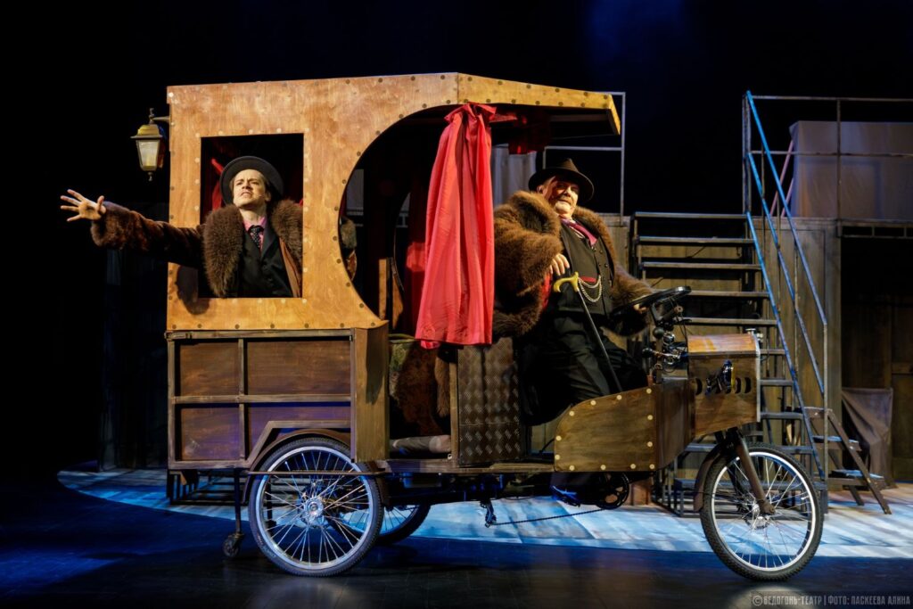 Убранство сцены постоянно меняется (художник – Анастасия Глебова): то сладко-розовая дворянская комната, то серая невзрачная обстановка, похожая на какие-то задворки, то вдруг настоящая карета: то Василий Петрович в назидание угрожает переехать сына, то управление захватывает сам Александр, а для каких только целей не служит сам кузов! Персонажи то и дело прячутся там, оставляя на догадку зрителей, что же происходит за красными шторками окна. Словом, этот агрегат вызывает переполох и удивляет зачастую не только зрителей, но и самих героев.