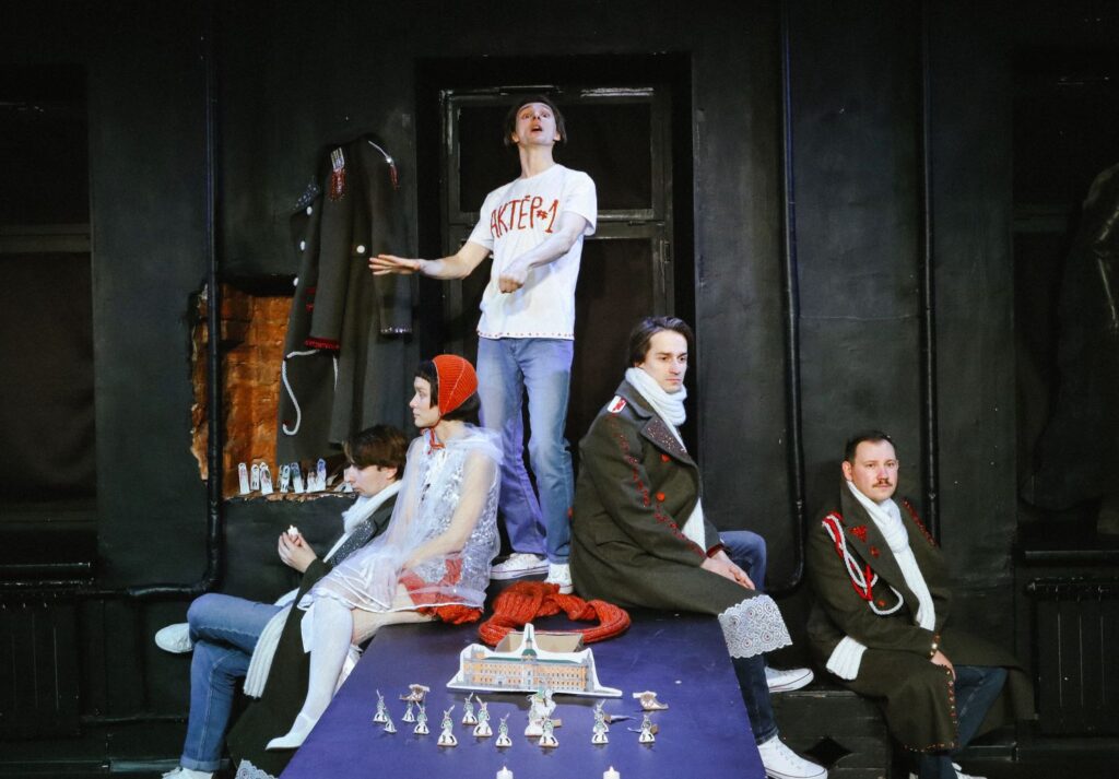 На удивление сильна была рука художников по костюмам Кати Чин и Александры Митенковой. Жесткий мужской металл пуговиц военных шинелей был нежно оплетен заботливым вязаньем ждущих своих ребят из армии невест. Не обошлось и без концептуального спора: с монологом Гамлета, которого все ждали и который прозвучал в устах Романа Вебера как бы постскриптумом пьесы, спорила Актриса №1, в уста которой режиссер и автор инсценировки вложил сентенции о роли мальчишек в истории в духе «Вы побеждали и любили / Любовь и сабли острие / И весело переходили/ В небытие.»