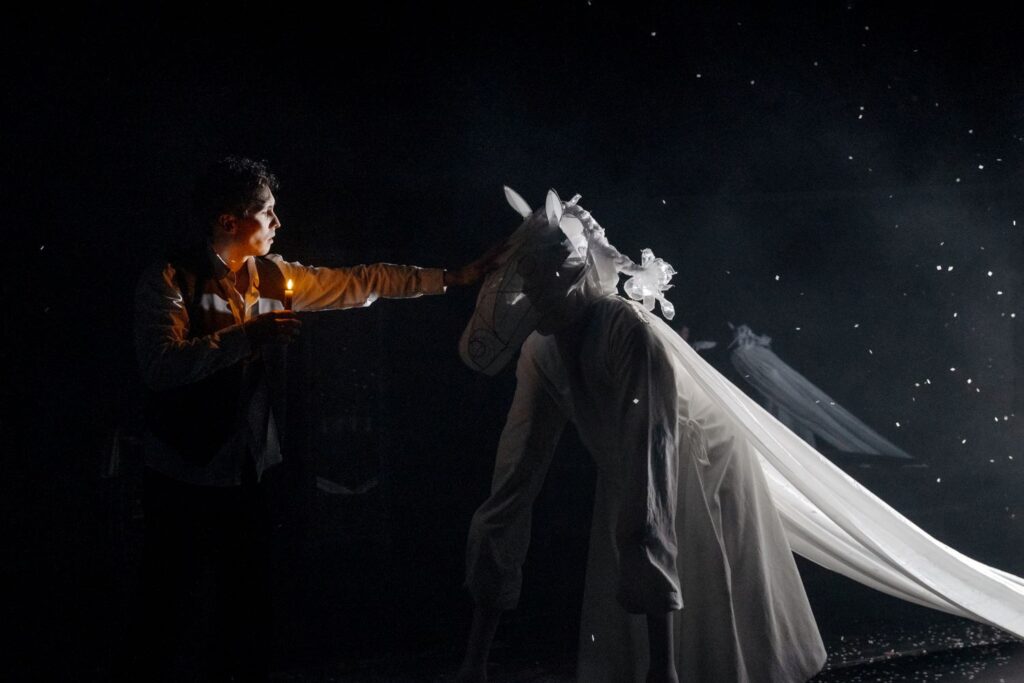 Режиссёр Александр Лимин, художник-постановщик Василиса Кутузова и художник по свету Денис Краснощёков для изображения иллюзий Полякова используют лёгкие прозрачные ткани, дымку, лучи «солнца», музыку (Антонио Вивальди, Джузеппе Верди и др.). На видеопроекции мелькают кадры видений одурманенного доктора – фантазийные певицы и бог сна Морфей. Из ниши в сцене выходят бравый красноармеец, откуда ни возьмись возникает чёрный монах.